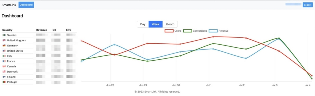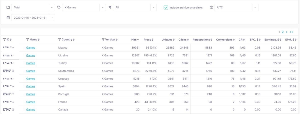 На скріншотах нижче детальна статистика по конверту в розрізі різних ГЕО. Афілейти можуть отримати доступ до цифр після апруву запиту на підключення смартлінки.