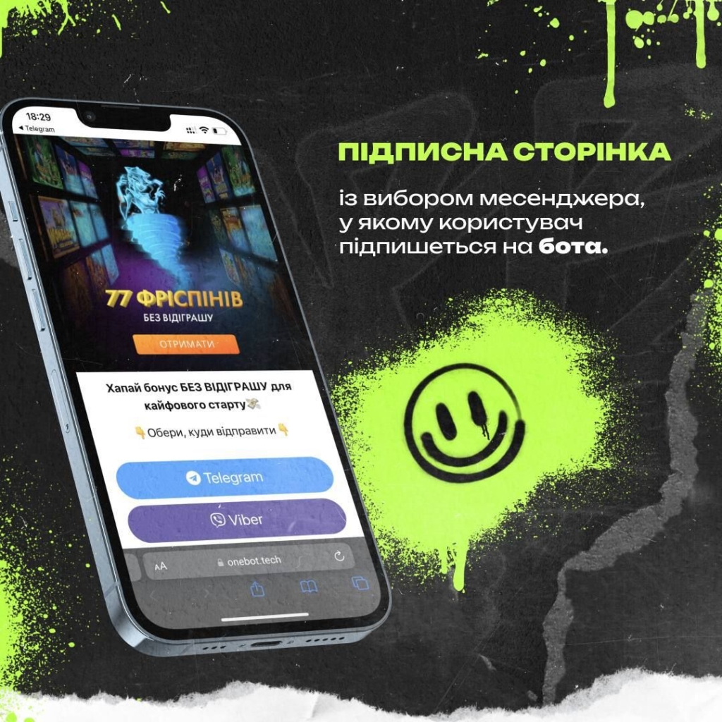 Веби тестували багато підходів, але найприбутковішим виявився залив через чат-ботів. Після кліку по креативу юзер потрапляє на підписну сторінку з вибором месенджеру. Далі йому залишається обрати між Телеграмом чи Вайбером.