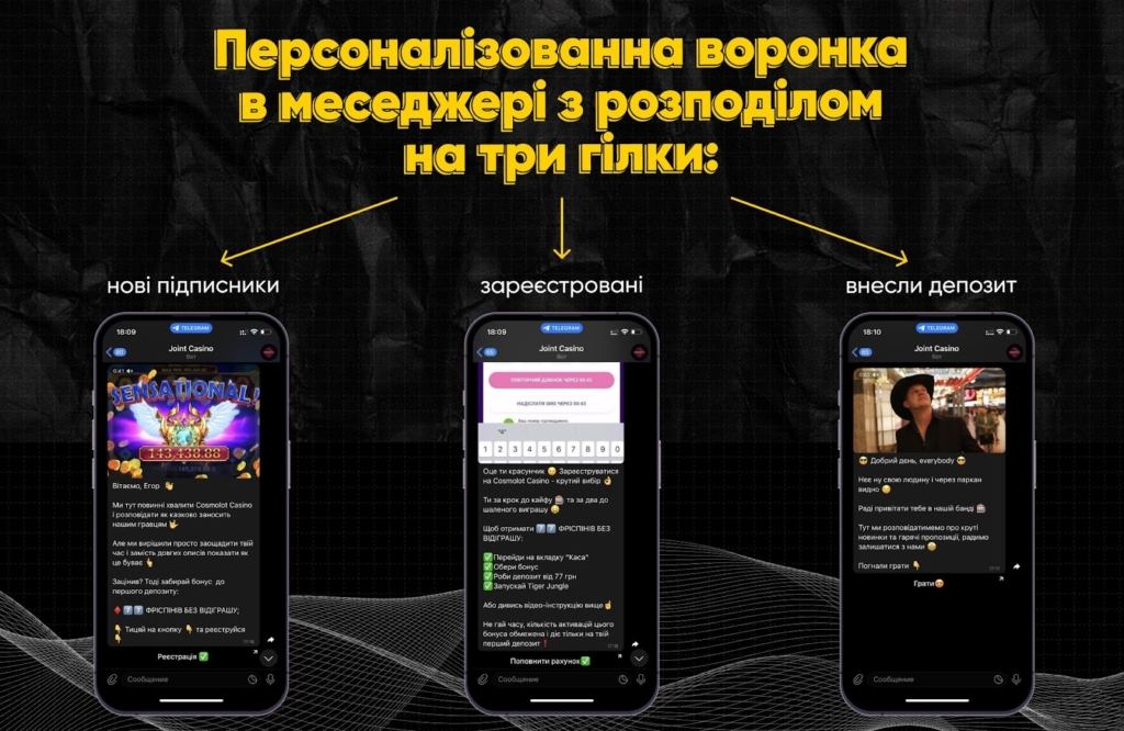 Наступний крок воронки — вітальні повідомлення з прогрівом на реєстрацію. Якщо користувачі переходили за посиланням та створювали обліковий запис — вони отримували наступне повідомлення з бонусами. Тих, хто зробив депозит також не обділили увагою.