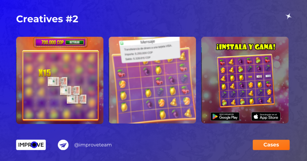 Ми провели тести декількох підходів, таких як звичайні барабани, колеса, новини, емоції, і зосередилися на тому, що спрацювало найкраще — “ТРИ В РЯД”. Концепція креативу включає набір символів популярного слота, об’єднання трьох символів та виграш.