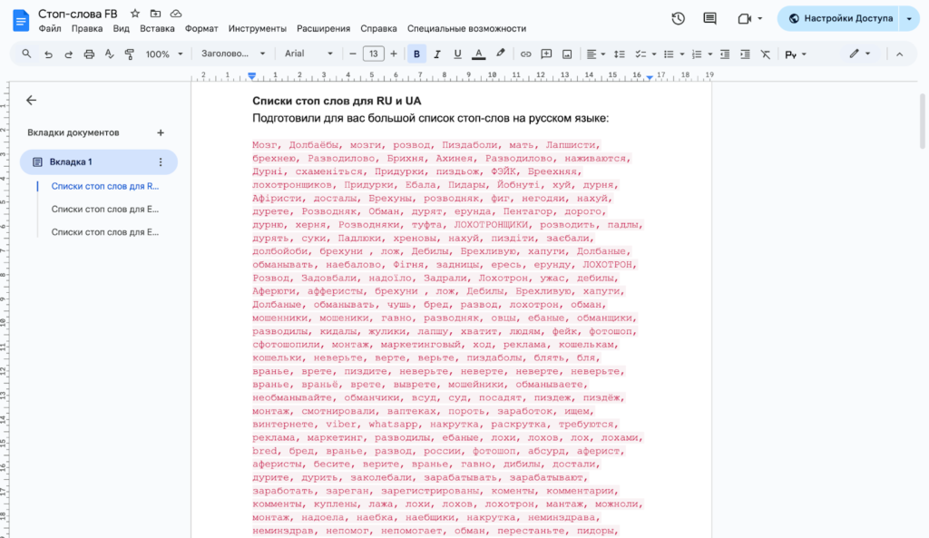 Для початку нам потрібно підібрати стоп-слова, які Facebook буде приховувати. Під стоп-словами може бути все що завгодно: “шахрайство”, “обман”, “розвод”, “плацебо” тощо, що часто зустрічається у негативних коментарях по вашій тематиці. За цим посиланням ви можете завантажити документ із прикладами стоп-слів для різних ГЕО.