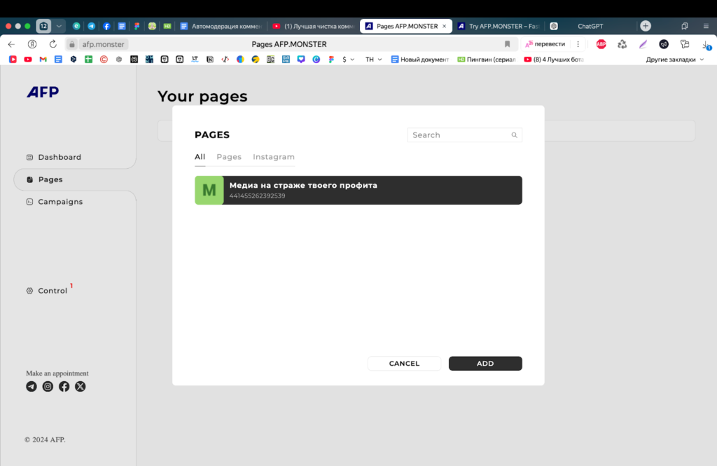 Як автоматизувати цей процес? Раніше ми згадували про Afp.Monster (якщо знаєте аналоги — напишіть у коментарях, дякуємо!). Переходимо за посиланням, логінимось ось через акаунт FB. У вкладці “Pages” ви побачите свої ФП на цьому акаунті. Обираємо фанпейдж і натискаємо “Add”.