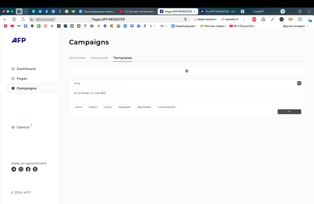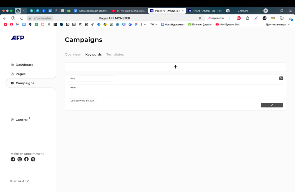 Далі переходимо у вкладку “Campaigns” і спершу нас цікавить вкладка “Keyword”. Тут ви вписуєте ключові слова для повідомлень, на які плануєте відповідати в автоматичному режимі. Наприклад, додаємо слово “Price” (нижче можна вставити безліч його похідних).