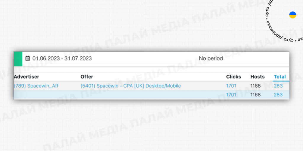 - Узгодивши пролив без КПІ, ми відлили трафік та стопнулись для перевірки якості. Менеджер SpaceWin відповів, що все добре і запропонував продовжити пролив. Загалом ми надсилали трафік на казино з 21.06 по 04.07.