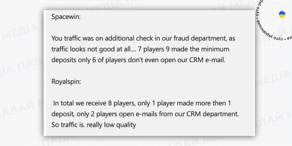 - По домовленостях, час звірки – 20 число. Представники казино пропали, затримали фідбек. Але, як результат, трафік виявився або фродом, або мотивом і оплачувати вони його не будуть.