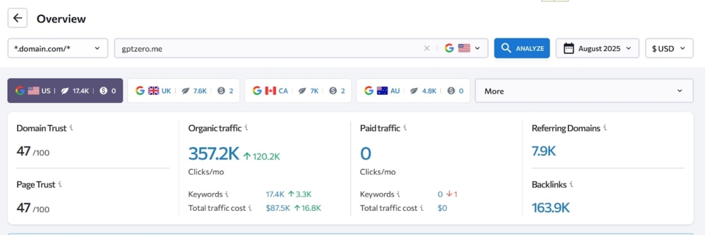 Якщо відкрити пошукову видачу, то дійсно на першому місці показується сайт ZeroGPT, а GPTZero на 3-4 позиції. Він втрачає левову частку трафіку через таку конкуренцію. SE Ranking оцінює трафік GPTZero у 357 000 користувачів щомісяця, а GPTZero — 850 000.