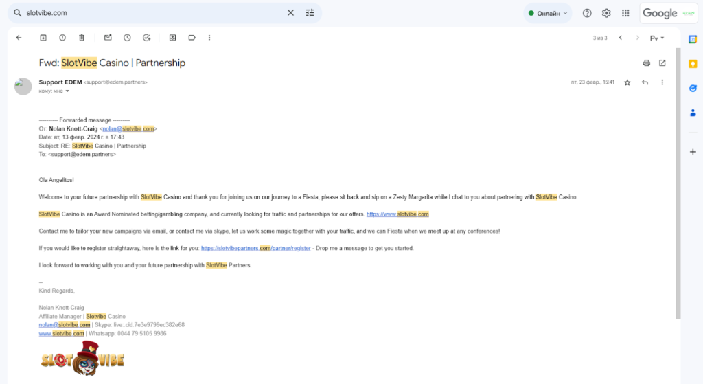 - 21 жовтня 2024 року: нас видалили з робочого чату в Skype, а наш обліковий запис у партнерській програмі SlotVibe Partners було заблоковано. З цього моменту компанія повністю припинила будь-який контакт із нами.