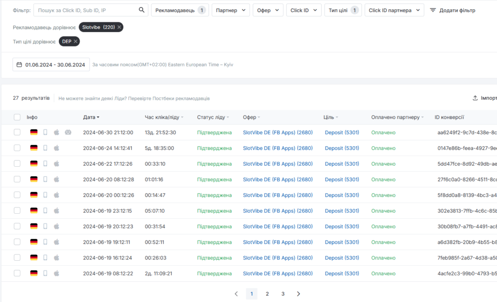 - 5 липня 2024 року: проведено звірку за трафік, узгодили підсумкову цифру до оплати 27 FTD на сумму €7830. Рекламодавець підтвердив звірку, не висловивши жодних претензій щодо якості трафіку чи мультиакаунтів.