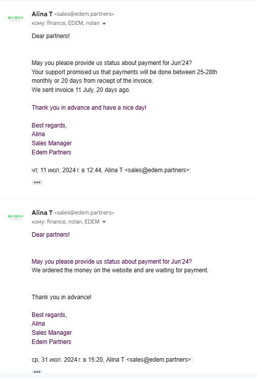 - Зрозуміло що до кінця липня жодної оплати не надійшло. Наші запити до менеджера Нолана залишилися безрезультатними – він радив звертатися лише до фінансового відділу (його керівництво) через email [email protected].