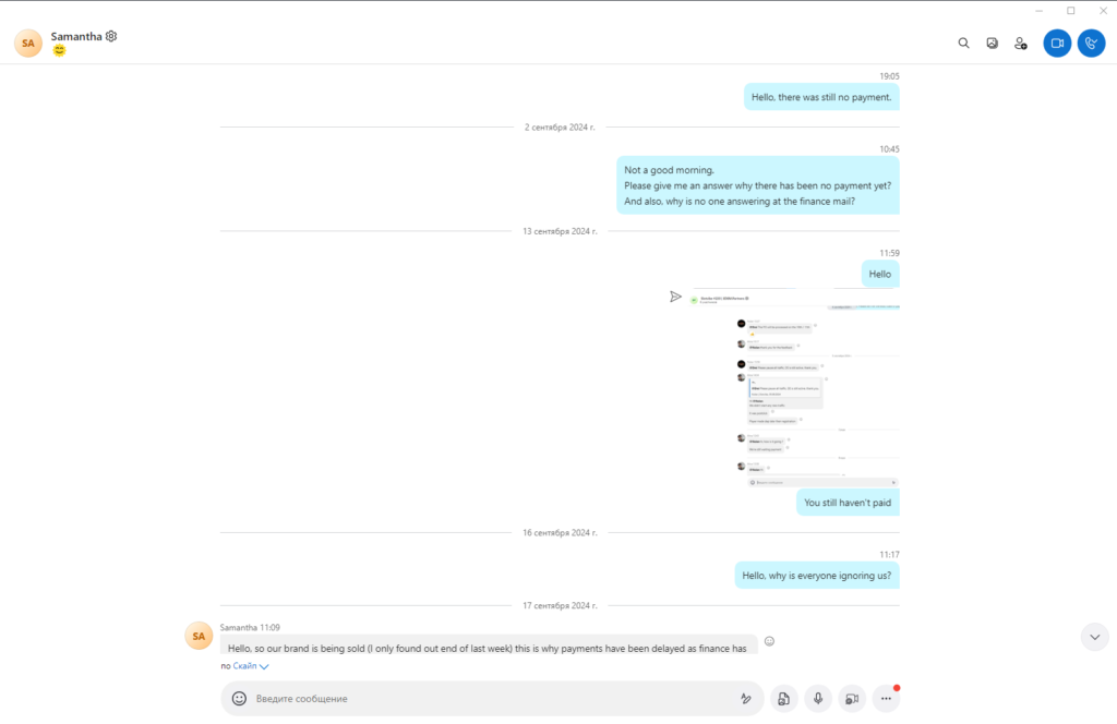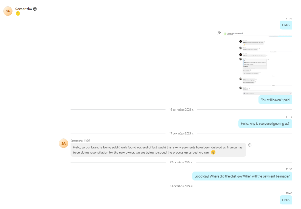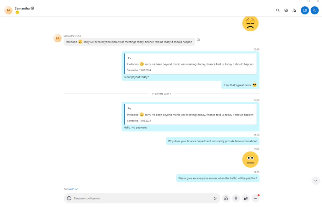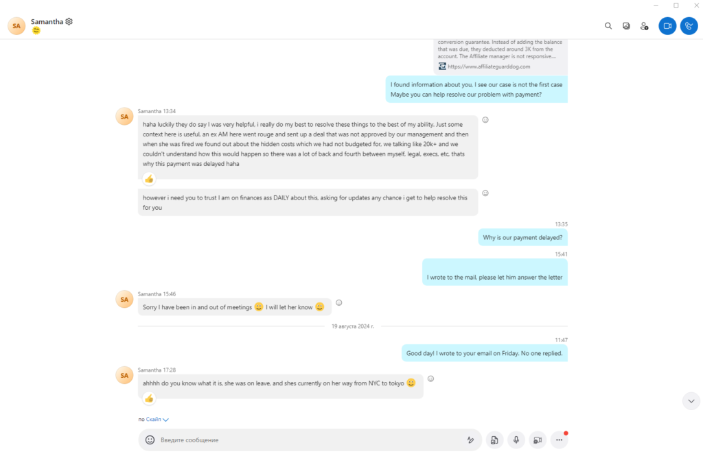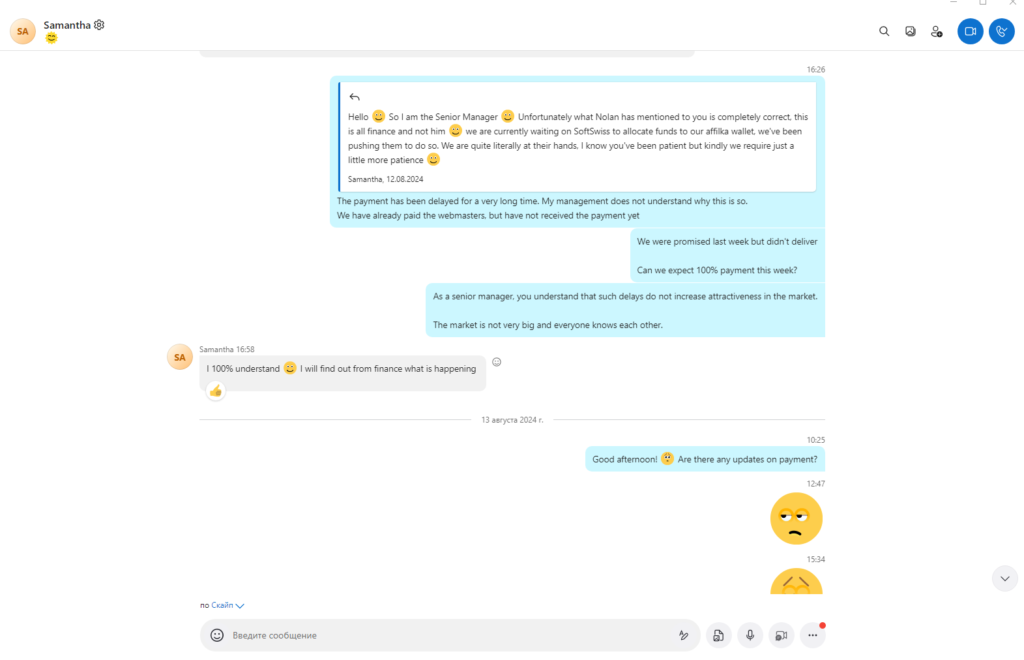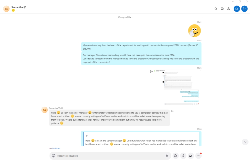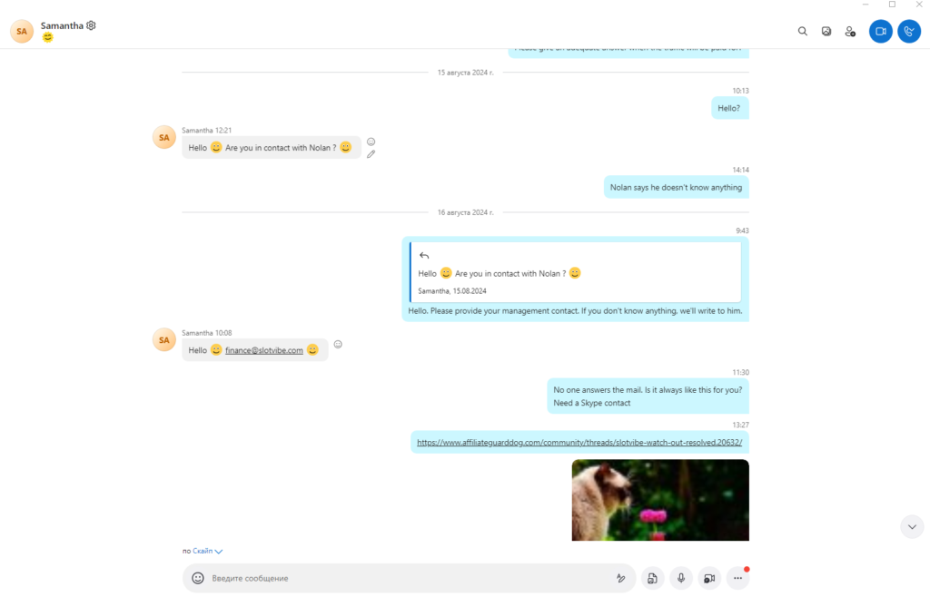 - 12 серпня 2024 року: ми знайшли контакт Саманти (Skype: live:samantha.mathey), яка, як ми зрозуміли, була старшим афіліат-менеджером SlotVibe. Ми почали вести діалог із нею. Проте ситуація не змінилася – обіцянки продовжувалися.