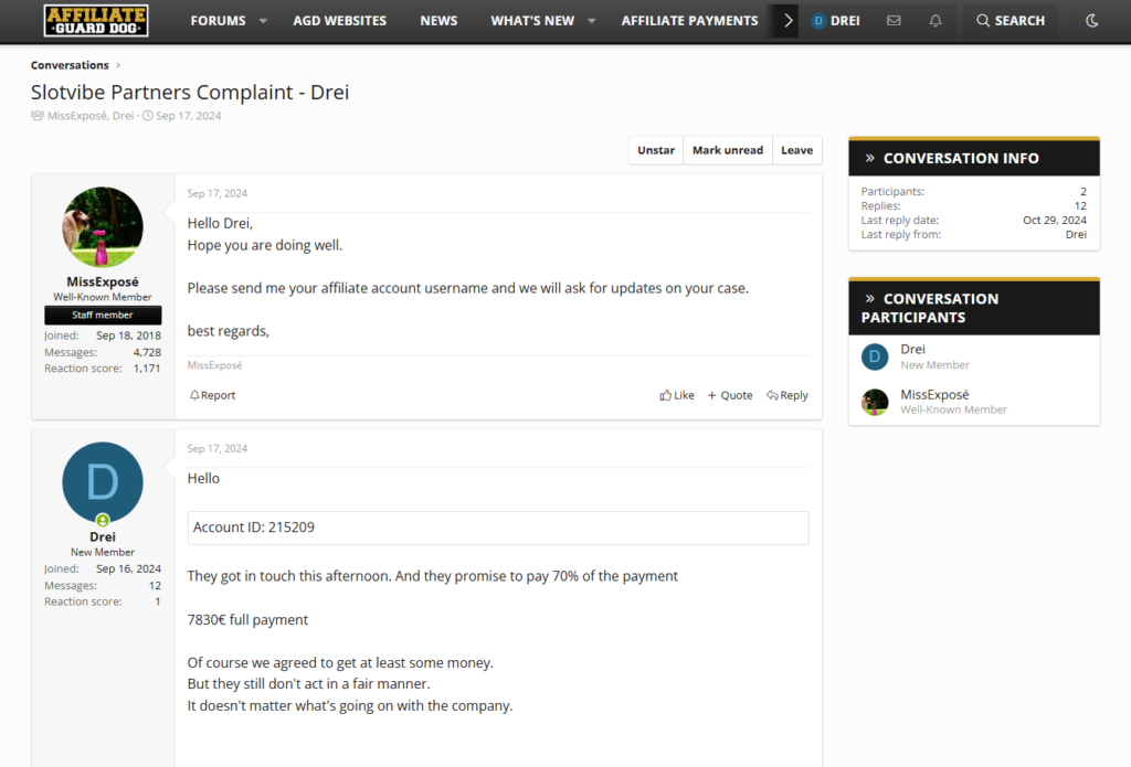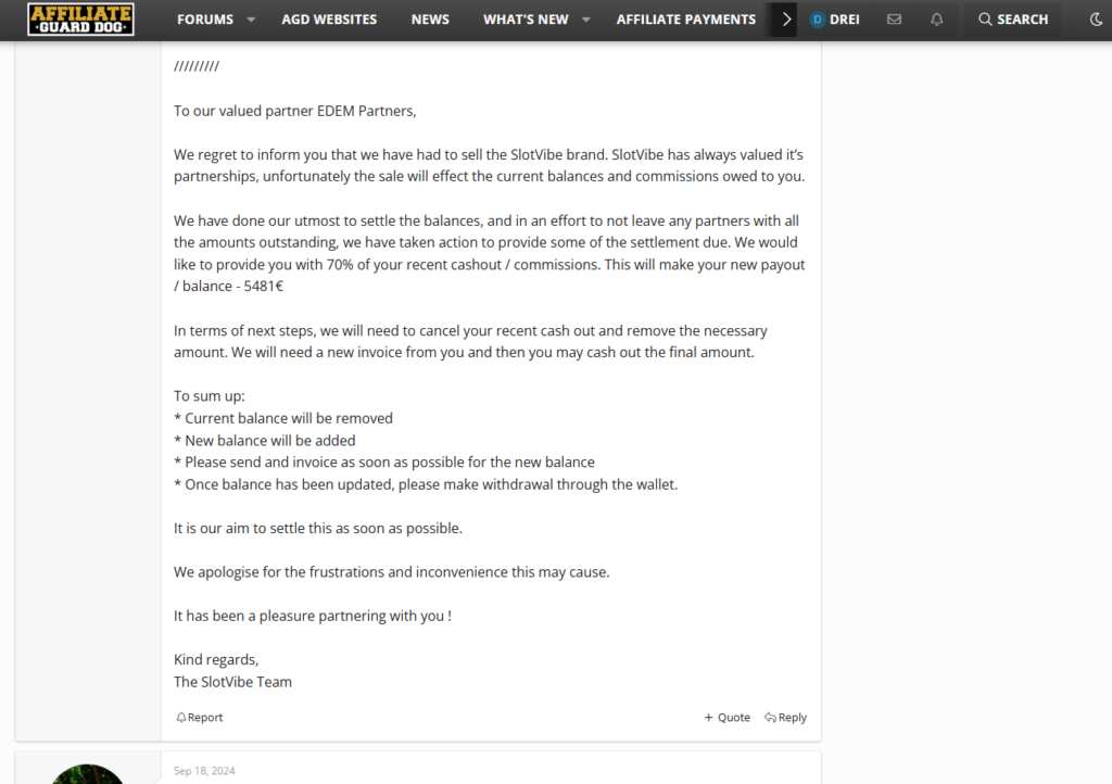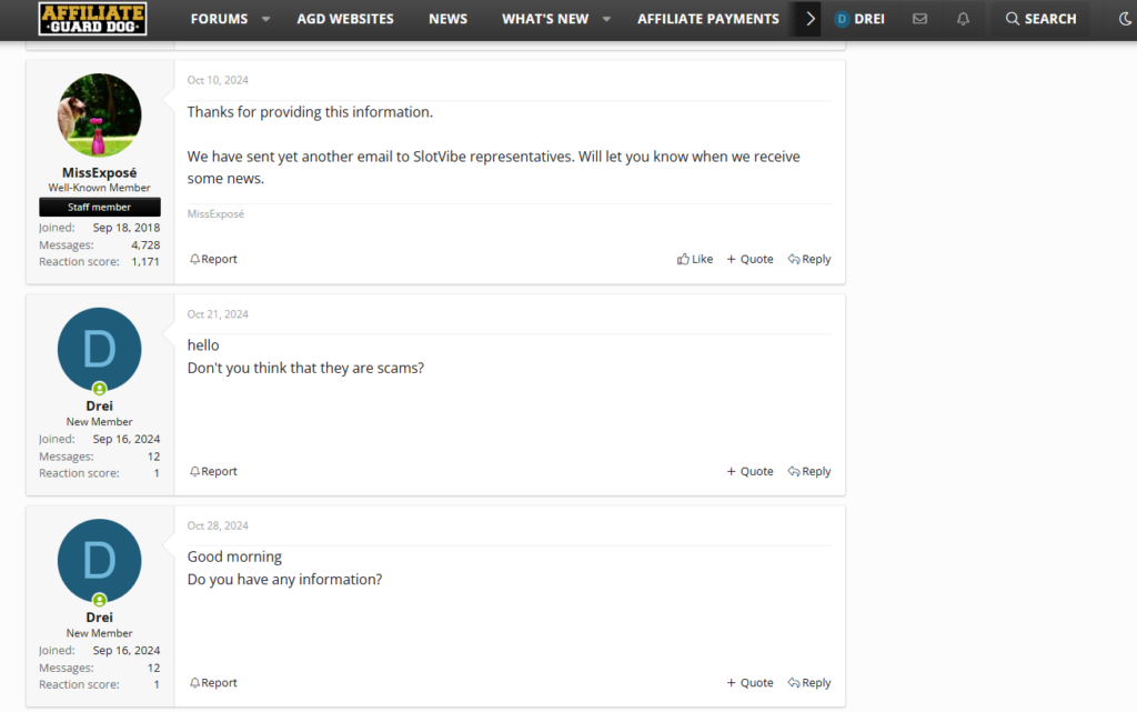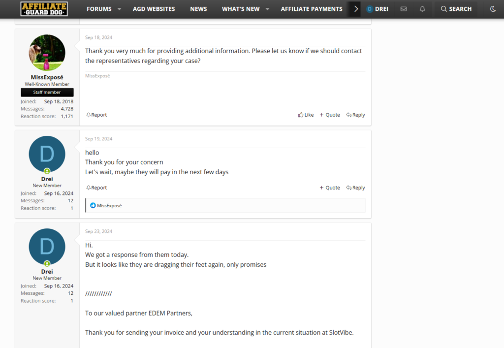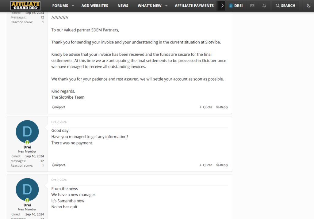 - 16 вересня 2024 року: шукаючи підтримки, ми створили тему на форумі AffiliateGuardDog, розповівши про невиконання зобов’язань SlotVibe.