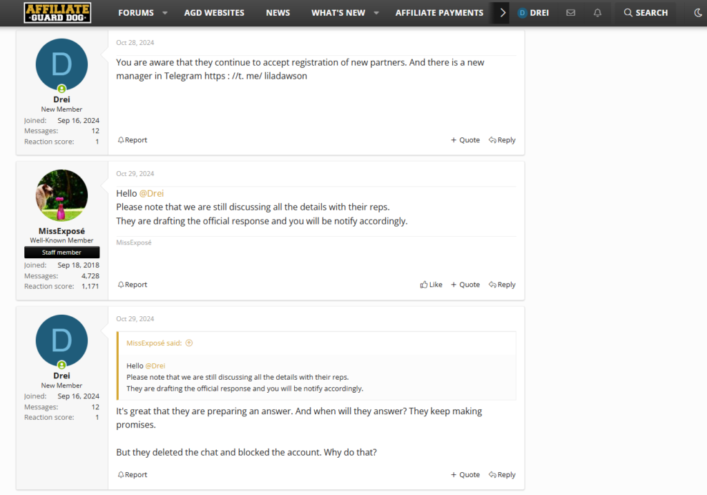 Усі, хто зіткнувся з подібними проблемами, можуть знайти більше інформації на форумі AffiliateGuardDog, де інші партнери діляться своїми історіями. Ми також готові надати підтримку, поділитися контактами та нашим досвідом.