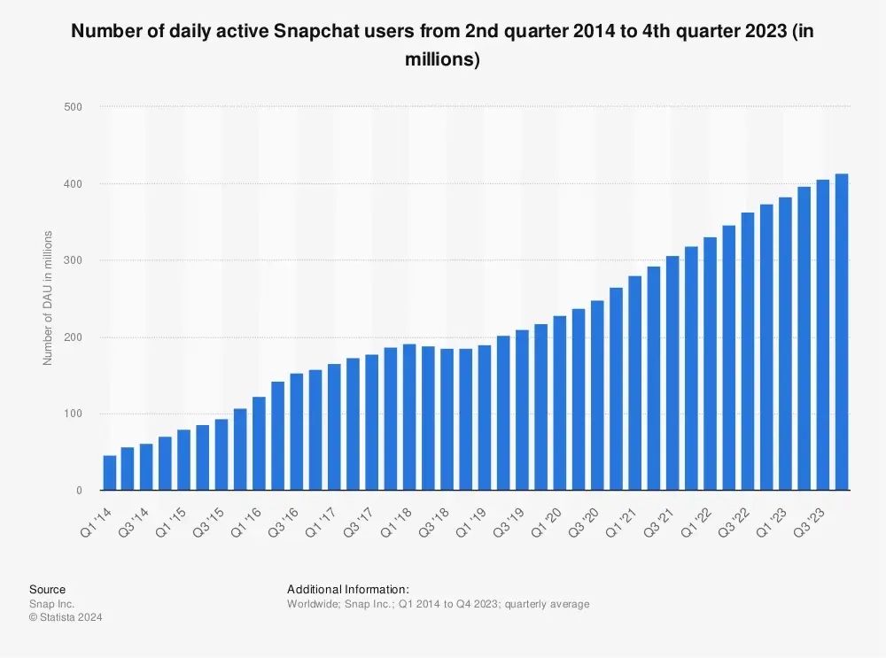 За даними аналітичних звітів, Snapchat може похизуватися авдиторією у 414 млн активних користувачів щоденно і 750 млн щомісяця. Соцмережа охоплює 90% населення віком 13-24 років та 75% населення віком 13-34 років у 25+ країнах світу.