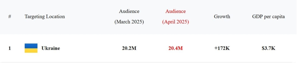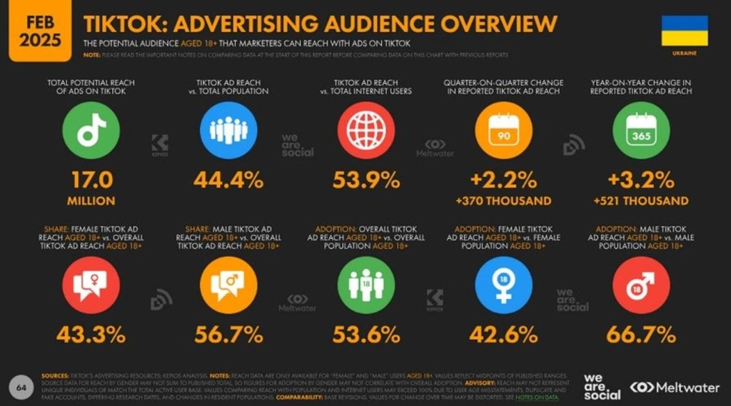 Згідно з даними PiPiAds, станом на квітень 2025 року, рекламна аудиторія TikTok в Україні перевищує 20,4 млн користувачів, що на 172 тисячі більше, ніж у березні. Це свідчить про стабільне зростання охоплень.