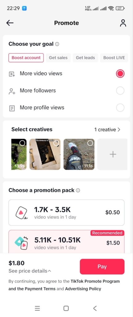 За спостереженнями таргетологів, які активно працюють з TikTok, на деяких українських акаунтах вже з’явилася кнопка «Просувати», яка доступна в картці відео.