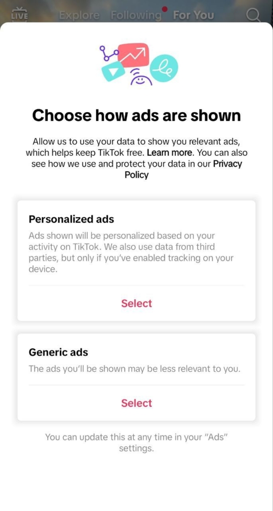 Нам під час чергового заходу в TikTok запропонували обрати формат відображення реклами: персоналізовані або генеровані. Це ще один доказ, що соцмережа почала активну роботу в напрямку відновлення рекламних можливостей.