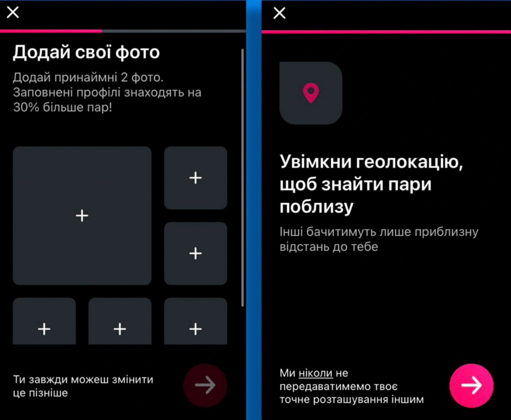 Користувачам пропонують зазначити базову інформацію: ім’я, гендер і вподобання щодо статі людей, з якими вони хочуть будувати стосунки. Також можна обрати тип стосунків, які цікавлять — від романтичних до дружніх, і навіть кілька варіантів одночасно.