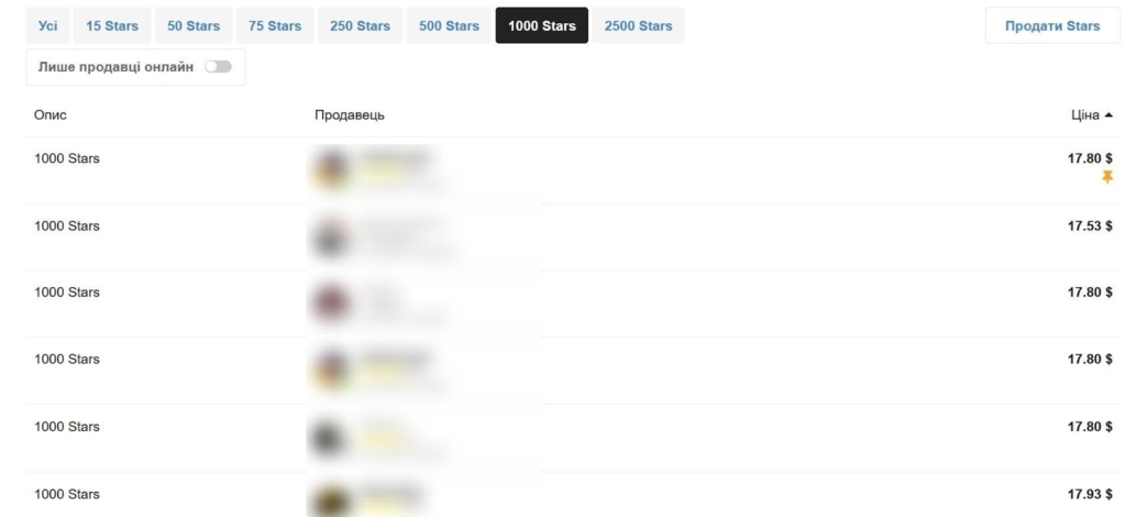 Середня вартість 1 000 зірок у селерів — $18. Але до цього треба додати 2% комісії платіжних систем і наявність російських провайдерів типу СШП. Більшість продавців з боліт, а це red flag.