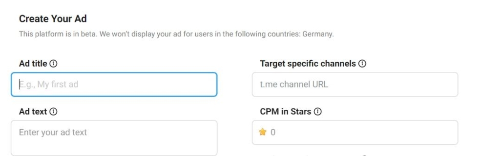 Зірки можна використати для запуску реклами каналу через Telegram Ads. В цьому варіанті з обмежень по ГЕО тільки Німеччина. Можна таргетувати рекламу на українських користувачів та не платити комісію агенціям.