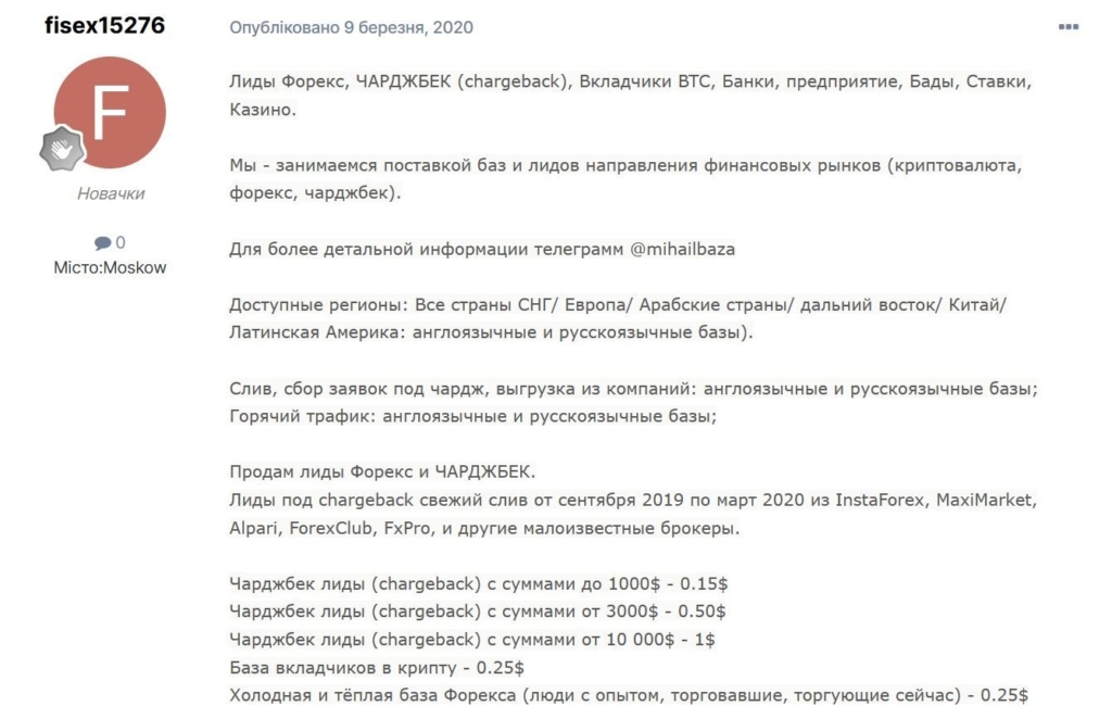 Селери навіть можуть продати списки, сегментовані за різними критеріями: регіон, мова, сума депозиту клієнта, зацікавлення криптоінвестиціями. Без додаткового аналізу зрозуміло, що це злиті дані з баз самих брокерів та інших постачальників фінансових послуг.