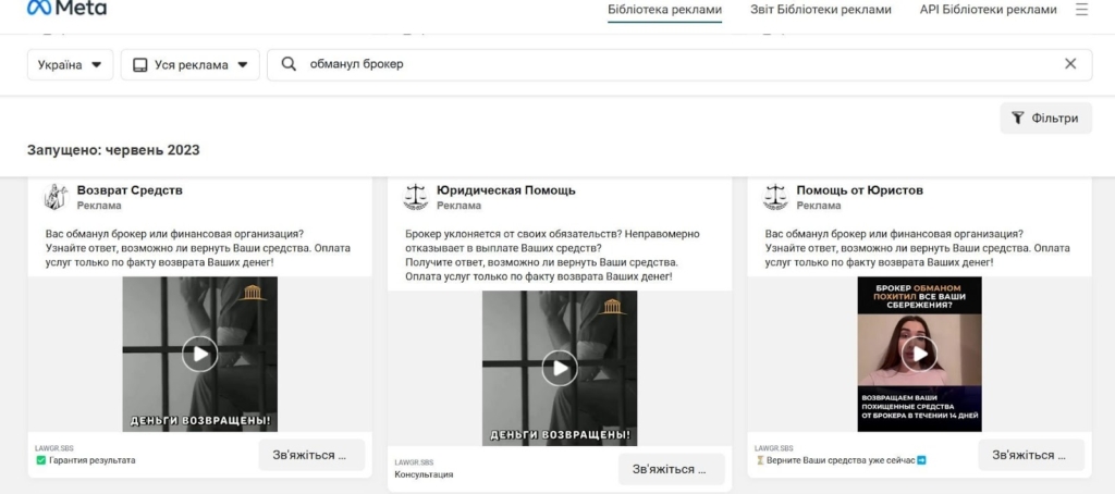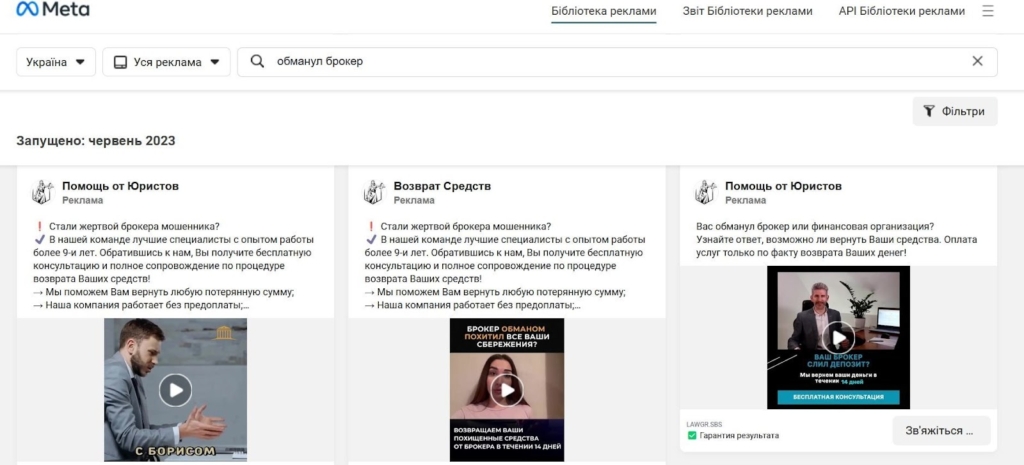 Якщо клієнт брокера або іншої фінансової установи позитивно відреагує на пропозицію шахраїв, то втратить ще більше грошей на «адвокатах». З ним зв’яжуться, розпитають та попросять внести передоплату за послуги або заздалегідь оплатити комісію. А далі все по класиці — компанія розчиниться у повітрі. Краще пропускати таку рекламу або відправляти скарги у підтримку Фейсбуку.