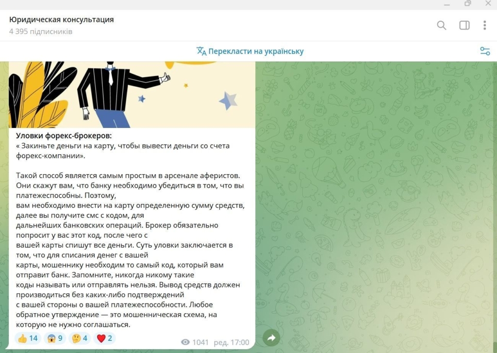 Також у воронках часто зустрічається прокладки через Телеграм-канали. В них накручують кількість підписників та діляться «корисним» контентом з прогрівом на оплату послуг.