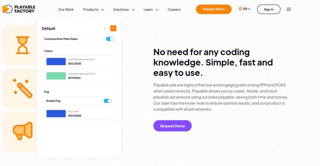 Серед топових сервісів — Playable Factory. За допомогою платформи можна створити креатив без знань програмування. У візуальному редакторі є налаштування кольорів, фону, звуків, складності гри та інших параметрів.