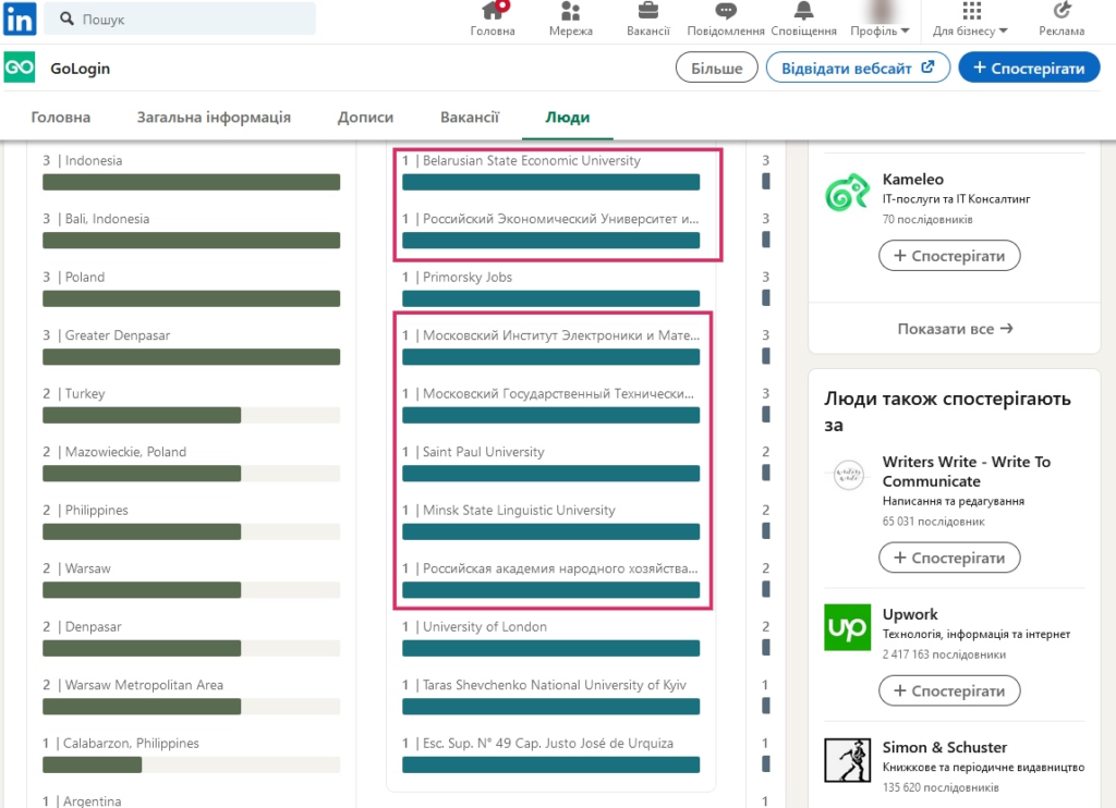 Відкриваєте сторінку, обираєте вкладку «Люди» і аналізуєте інформацію. У випадку нижче співробітники наче живуть в цивілізованій частині світу, але багатьох видає статистика освітніх закладів.