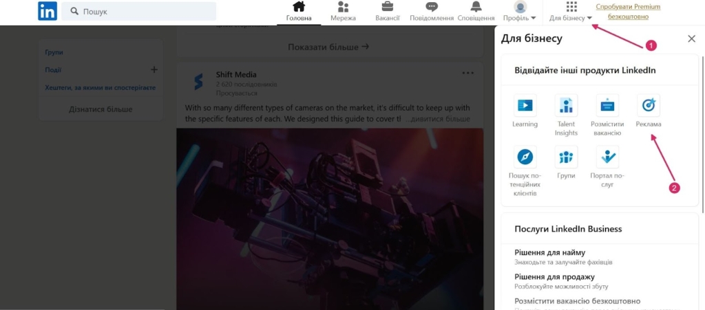 В LinkedIn є рекламний кабінет, який можна використовувати для запуску кампаній. У