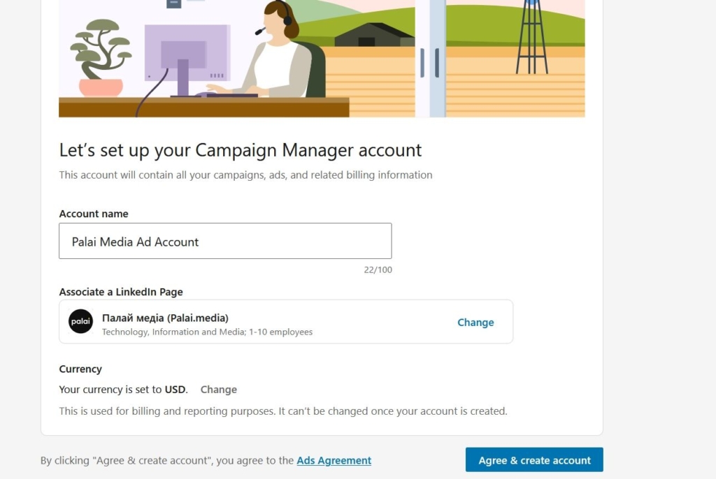 Для запуску реклами потрібно налаштувати бізнес-акаунт — звичайний профіль не підходить. Профіль для реклами створюється в кілька кліків. Система просить вказати назву акаунту та прив’язати сторінку організації.