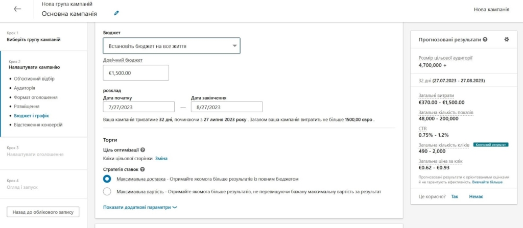 Для тесту ми вказали ГЕО Україна та вилучили кілька нерелевантних категорій інтересів. Система показує максимальний спенд за місяць — 1 500 евро. За ці гроші нам обіцяють до 270 000 показів та 1 900 кліків. Максимальний CPC складає 0,99 евро, але на практиці цифри можуть бути на порядок вище.
