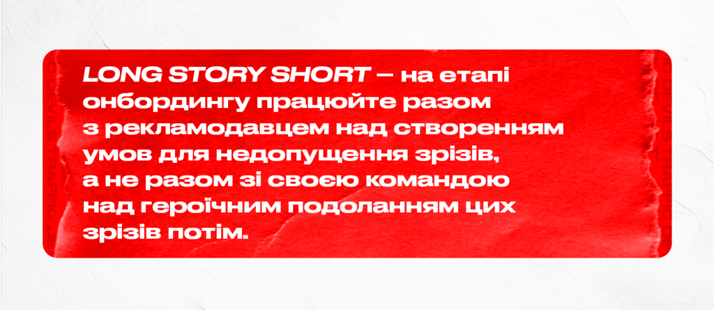 Зрізи бажано попередити, а не боротися з наслідками. Щоб не виникали зайві складнощі, домовтесь на старті про базові речі. Наприклад: тестові капи та трафік в будь-якому випадку оплачуються замовником.
