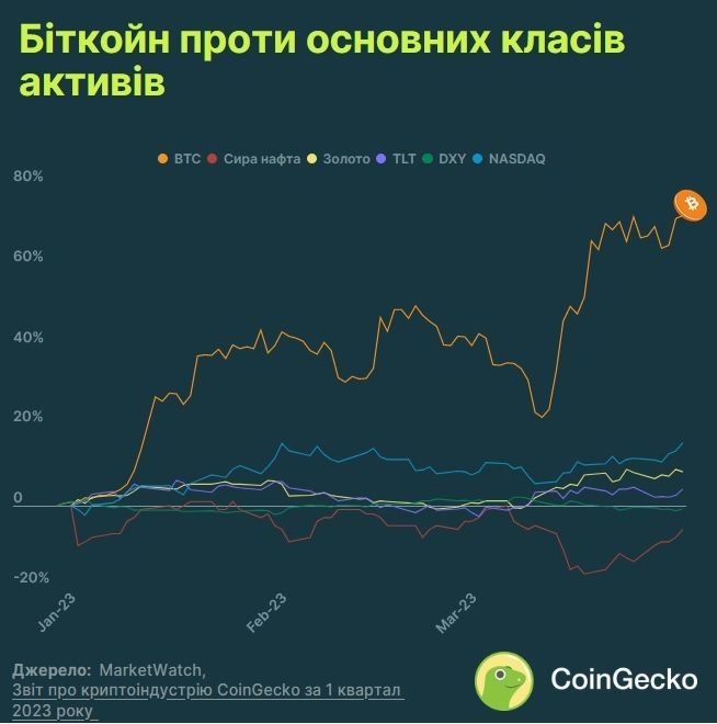 Багато фінансових аналітиків кажуть, що криптовалюти занадто волатильні, але біткоїн за результатами першого кварталу 2023 року став найефективнішим активом. Індекс NASDAQ та золото сильно відстають від нього.