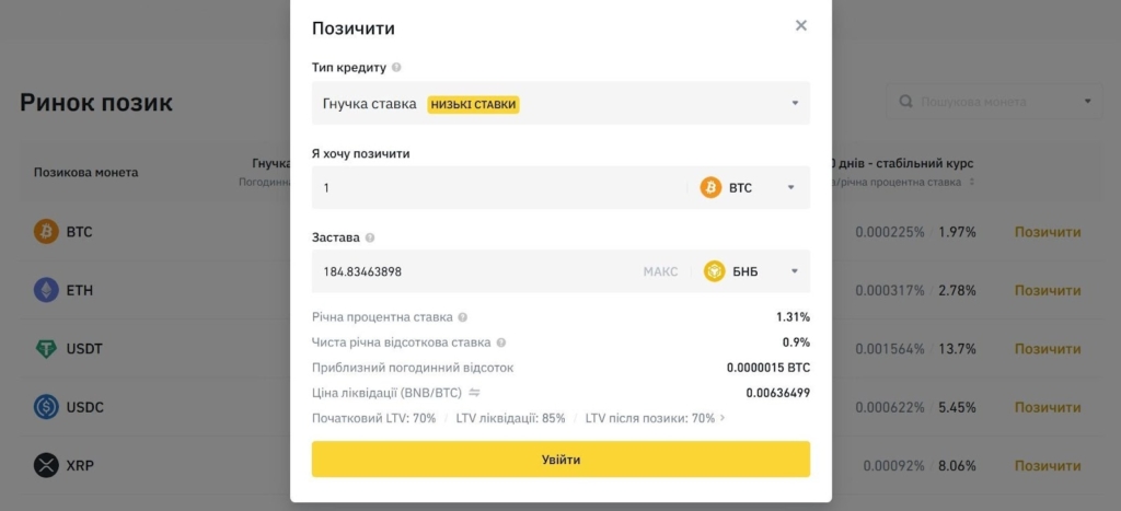 Одна з головних особливостей платформ криптопозик — автоматична ліквідація позиції, коли вартість монети сягне певної позначки. На скріншоті нижче є детальний розрахунок параметрів кредиту. Щоб взяти 1 BTC ($30 000), позичальнику потрібно внести 184,8 BNB ($43 000).