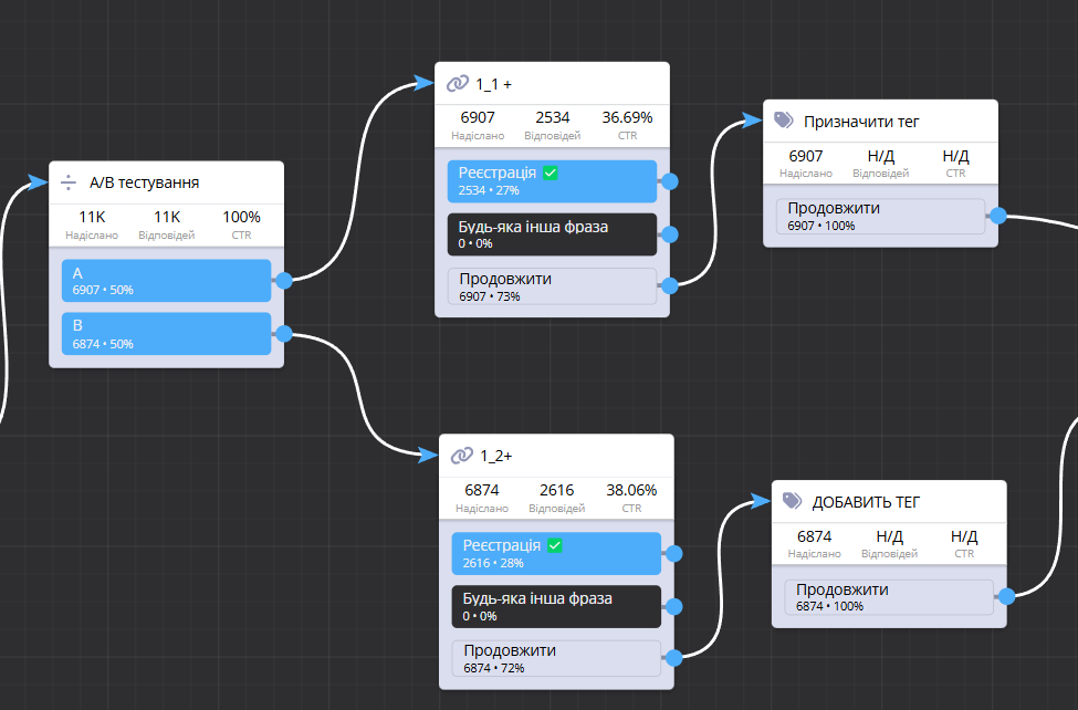 Для того, щоб ви могли відстежувати ефективність кожного етапу воронки, всіх блоків та пуш повідомлень, ми створили функцію підрахунку кількості натискань/відправлень. Це дозволяє в реальному часі оцінювати ефективність певних блоків або дій та коригувати стратегію комунікації з користувачами.