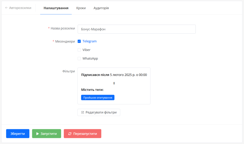 • Налаштування фільтрів для цільової аудиторії (за датою підписки або тегами).