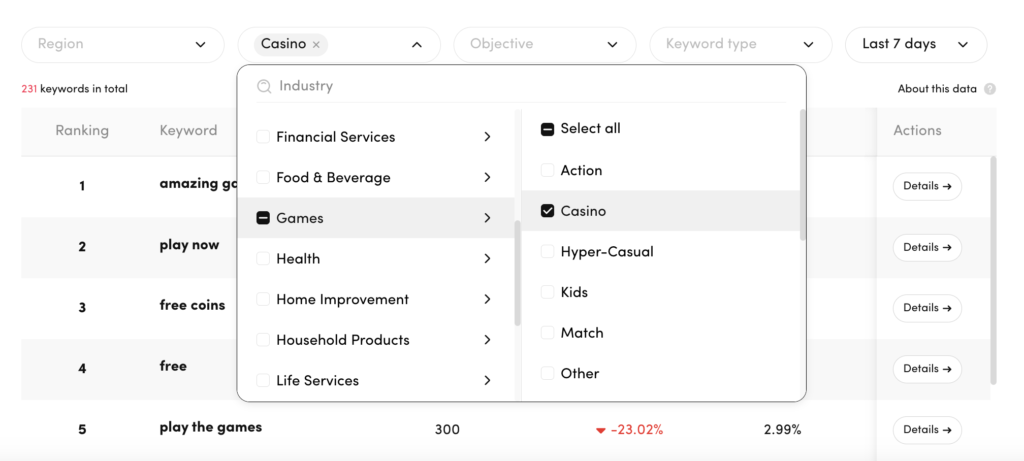 When working with the Industry filter, you can select more precise queries for each category by clicking on each section in the keywords list.