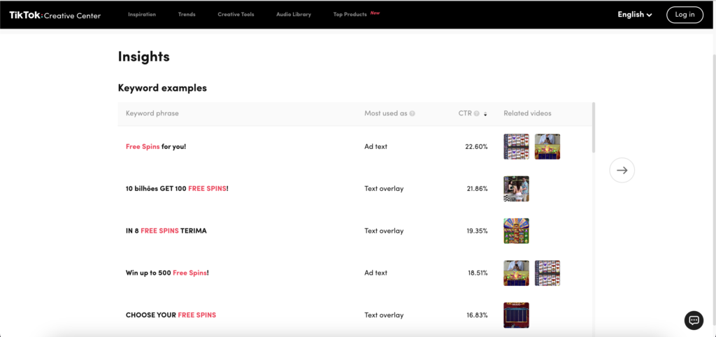 Insights is a TikTok keyword research tool that allows you to analyse competitors and create a more effective advertising strategy. In TikTok, trending keywords give you the ability to see the statistics of different competitors and create a more effective advertising strategy by knowing the best keywords for TikTok. Use and improve ROAS on your advertising campaigns wisely.