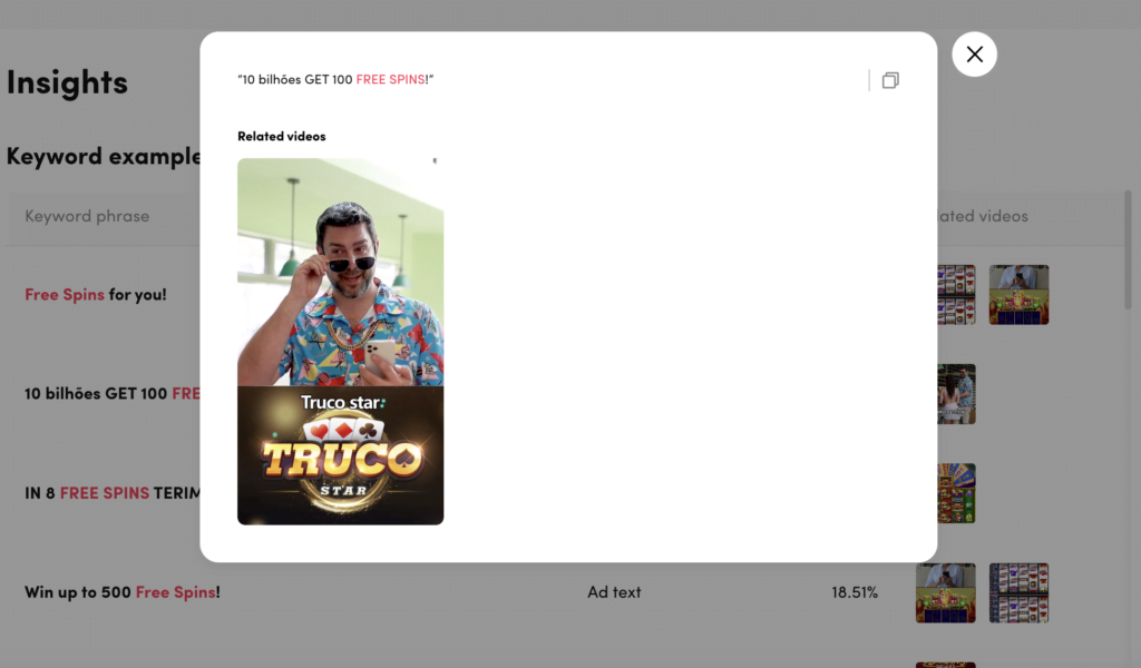 When you go to this section, you will see a list of ads for the keyword you have chosen, where the keyword is contained in the text format in the ad, in the video caption, or in the voice.