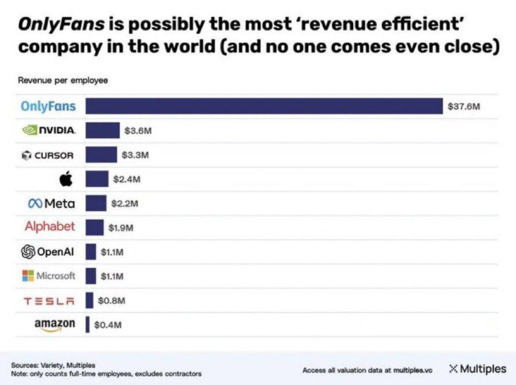 Платформа OnlyFans очолила світовий рейтинг за рівнем прибутковості на одного співробітника. Cередній дохід компанії на одного працівника становить $37,6 мільйона — показник, який у кілька разів перевищує результати навіть технологічних гігантів.