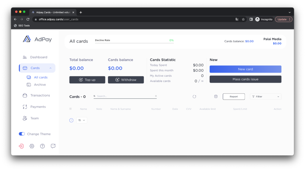 Adpay – сервіс віртуальних карток для афілейт-маркетологів та всіх, хто працює з трафіком Facebook Ads, Google Ads, TikTok Ads. Зручне рішення для командної роботи з бюджетами на рекламу. За рахунок того, що компанія працює з декількома банками, ви можете не хвилюватись за свої кошти, навіть якщо одна з фінансових інституцій блокує рахунки.