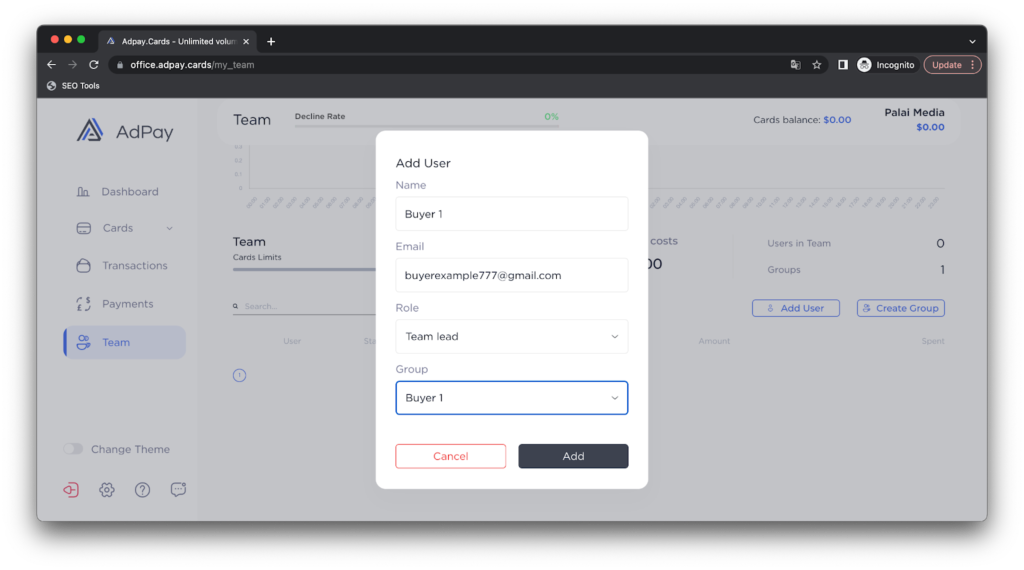 Також відзначимо функціонал для командного менеджменту – можна розподіляти тимлідів та медіабайерів, створювати окремі групи с кастомними лімітами та швидко відстежувати баланс спенду по кожному з учасників.