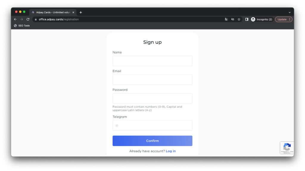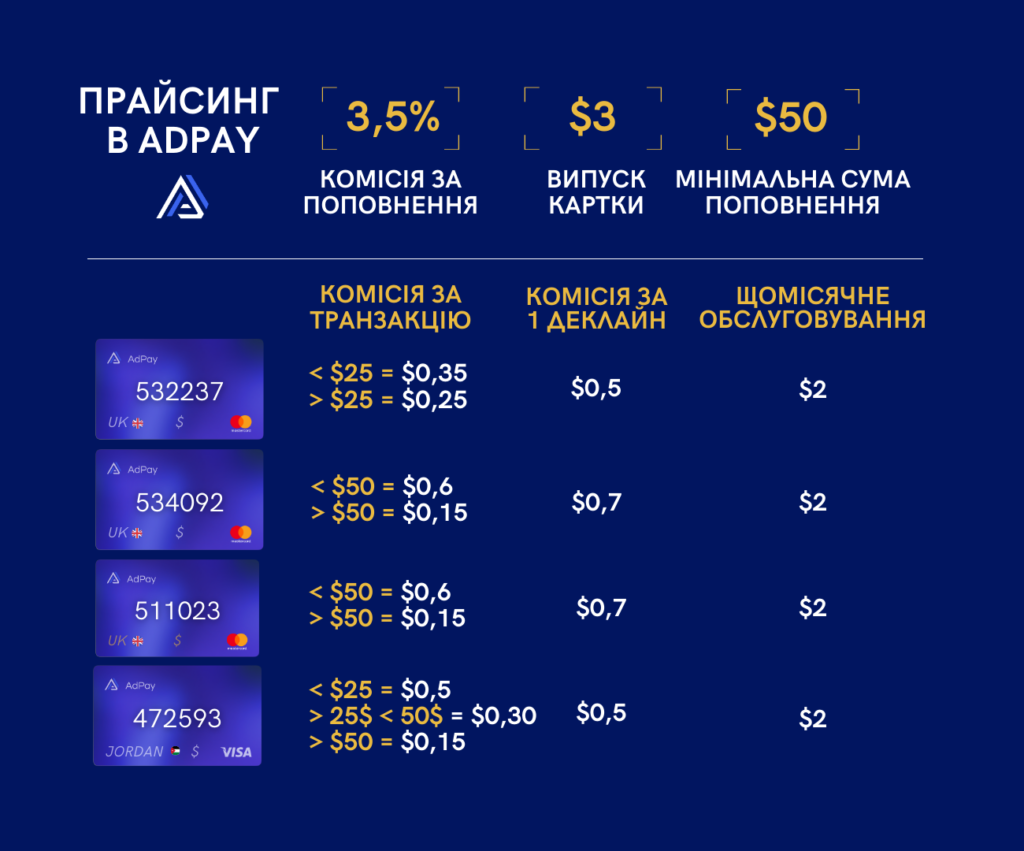 - у сервісі можна отримати картки країн-емітентів: Велика Британія, Йорданія. Карти Adpay в’яжуться до акаунтів будь-яких ГЕО.
