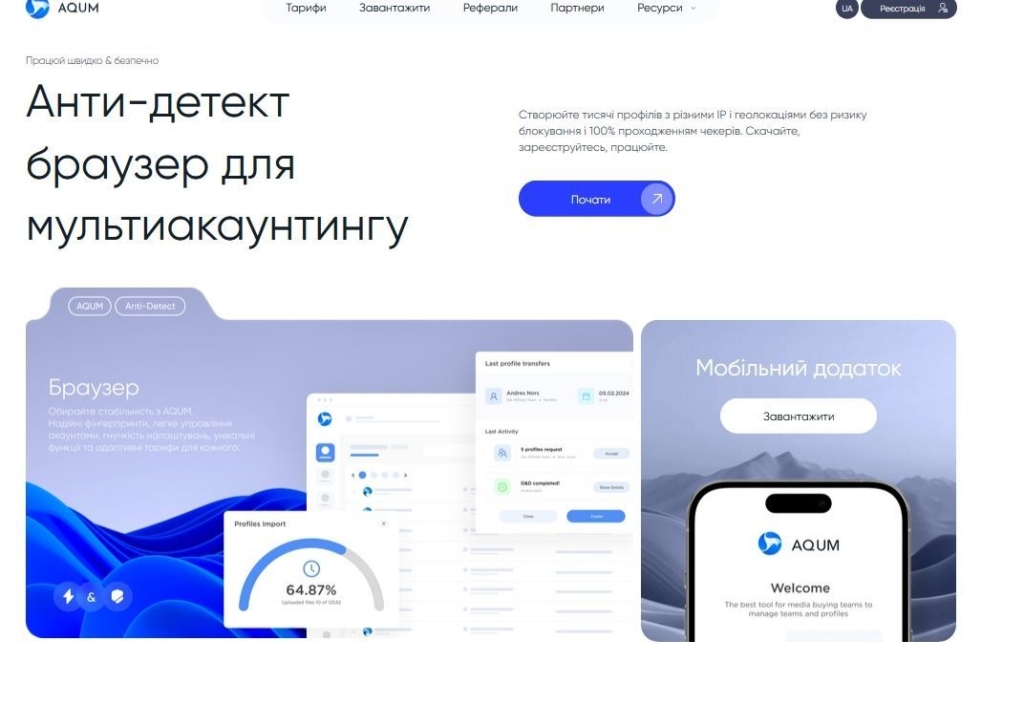 У AQUM під капотом: підміна відбитків на рівні ядра браузеру, командна робота, трансфер профілів, мобільний застосунок та інші фішки.