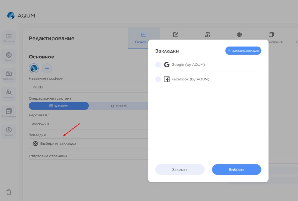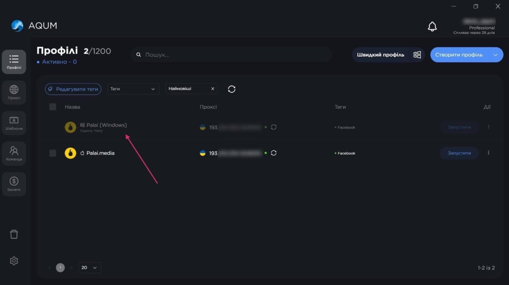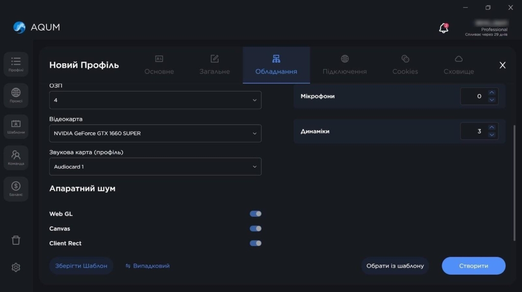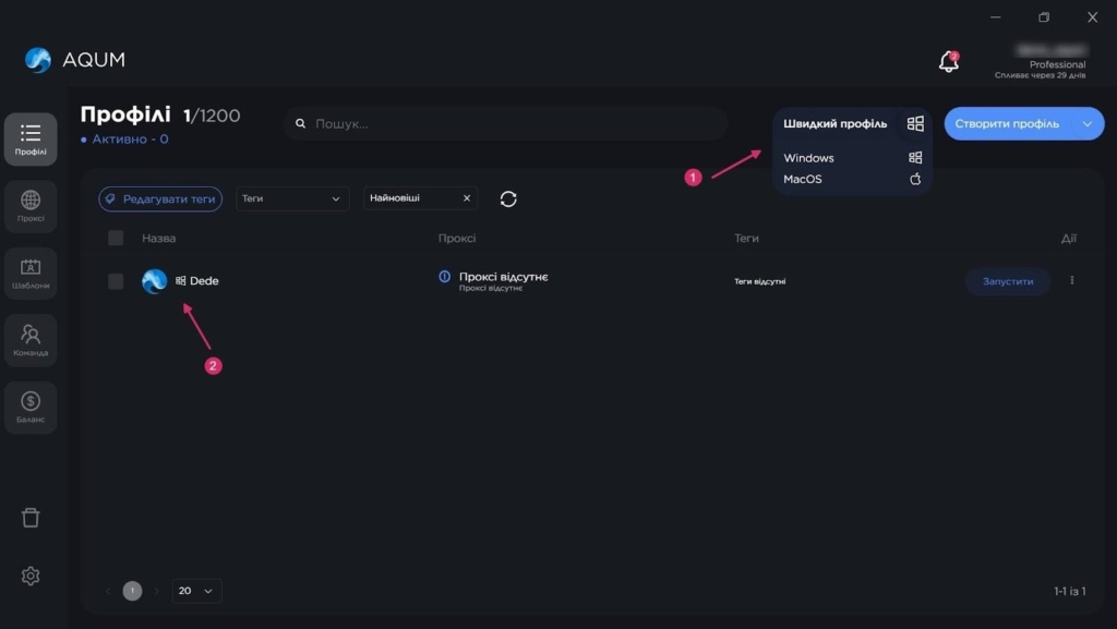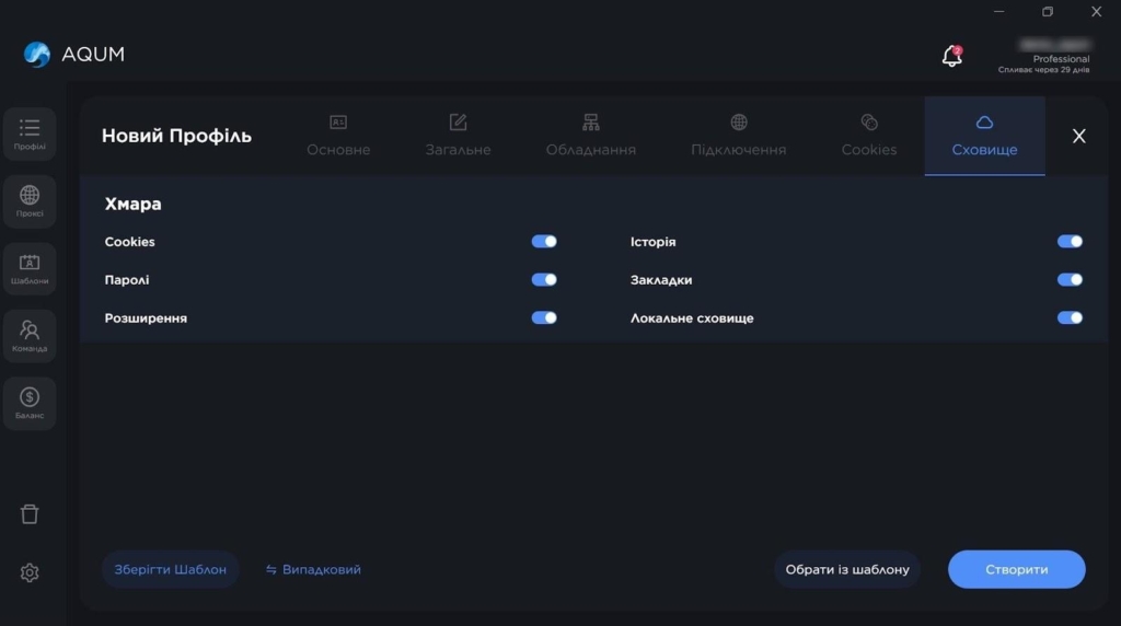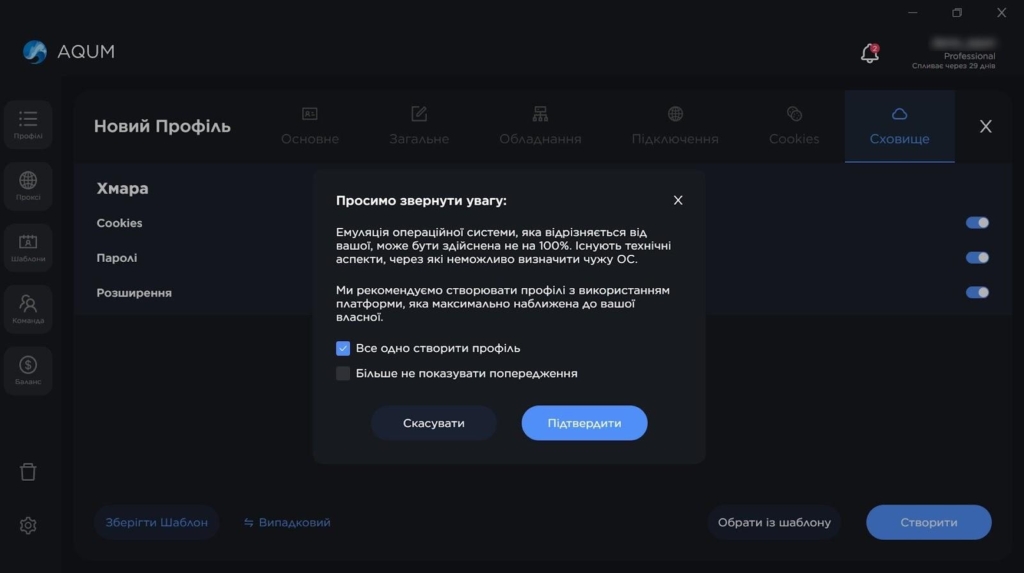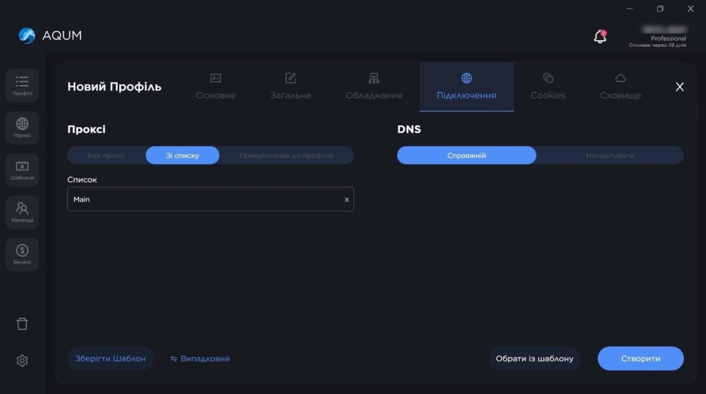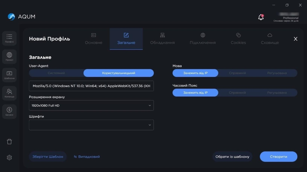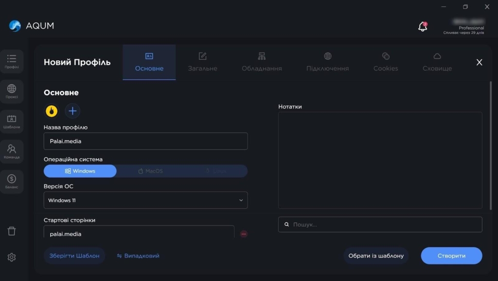 AQUM пропонує 3 формати роботи з профілями: швидке створення, глибоке налаштування та імпорт. Експрес-профіль генерується за кілька секунд, для цього треба лише вибрати операційну систему.
