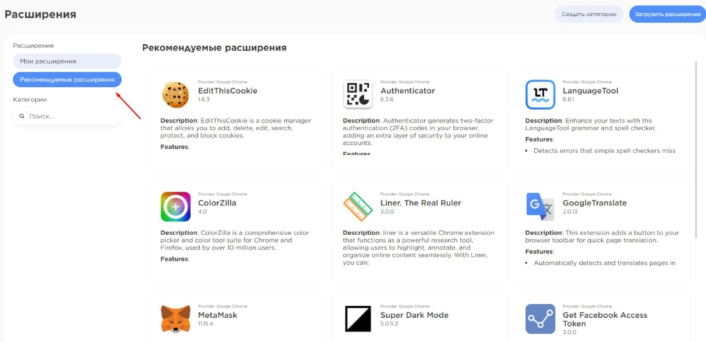 У вкладці з розширеннями можна додати пакет з комп’ютера або вставити посилання з маркетплейсу Chrome. Також є можливість створити категорію розширень для зручного сортування.