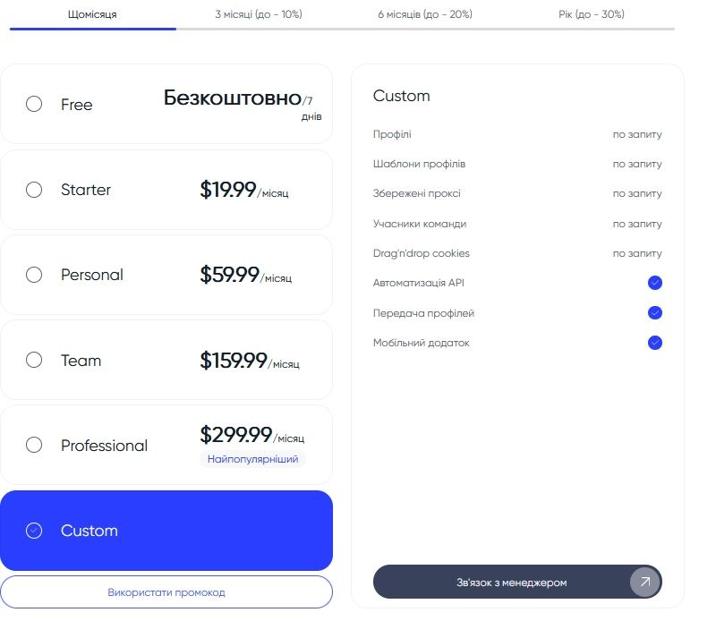 Великим командам сервіс пропонує гнучке ціноутворення з кастомними лімітами. Вартість стартує від $400+ за погодженням із сапортом. Можна додати будь-який потрібний функціонал в базові тарифи.