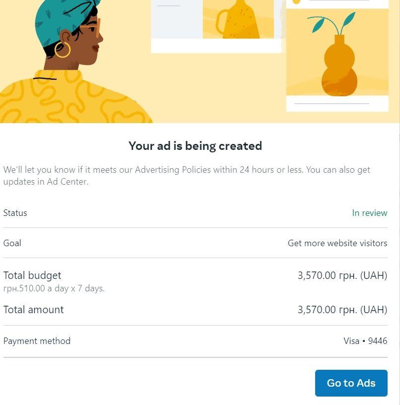 Картка підключилася не з першого разу, довелося взяти мобільні проксі, але більше чеків не було. Кампанія швидко пройшла модерацію, прилетів холд, але після оплати без проблем відспендила до першого білу.