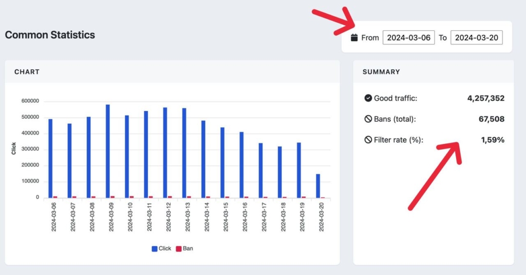 - Прозорість. Кожен клік, що потрапив до сервісу можна бачити real-time в статистиці та логу кліків. Більш того, надають вам повну інформацію стосовно причини потрапляння на вайтпейдж