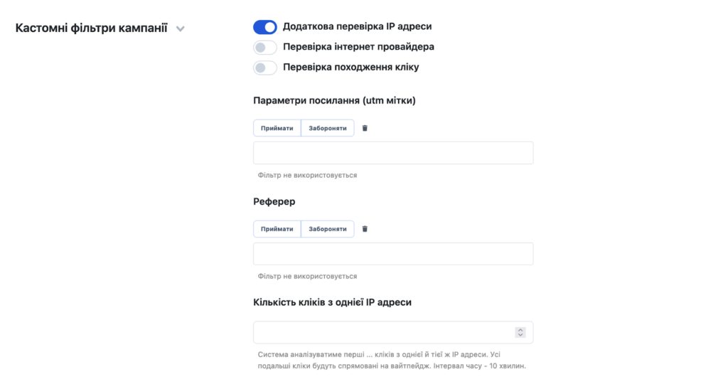 Одна з найголовніших переваг сервісу — можливість кастомізації логіки роботи враховуючи ваші побажання. Цей функціонал зроблено через те, що джерел трафіку дуже багато, та час від часу будь-де зустрічається “шторм”. Саме у цей час максимально розкривається функціонал кастомних фільтрів. На певних тарифах вам відкривається можливість підсилювати алгоритми фільтрації на рівні кампанії чи джерела трафіку.